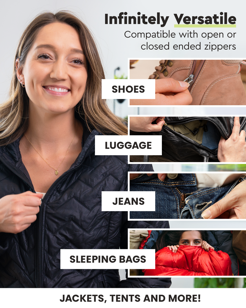Les curseurs ZlideOn s'ouvrent et se ferment grâce à un mécanisme de charnière breveté. Il suffit d'enclencher le curseur sur la chaînette de la fermeture éclair et de la fermer, restaurant ainsi la fonctionnalité de cette dernière sans outils ni couture.