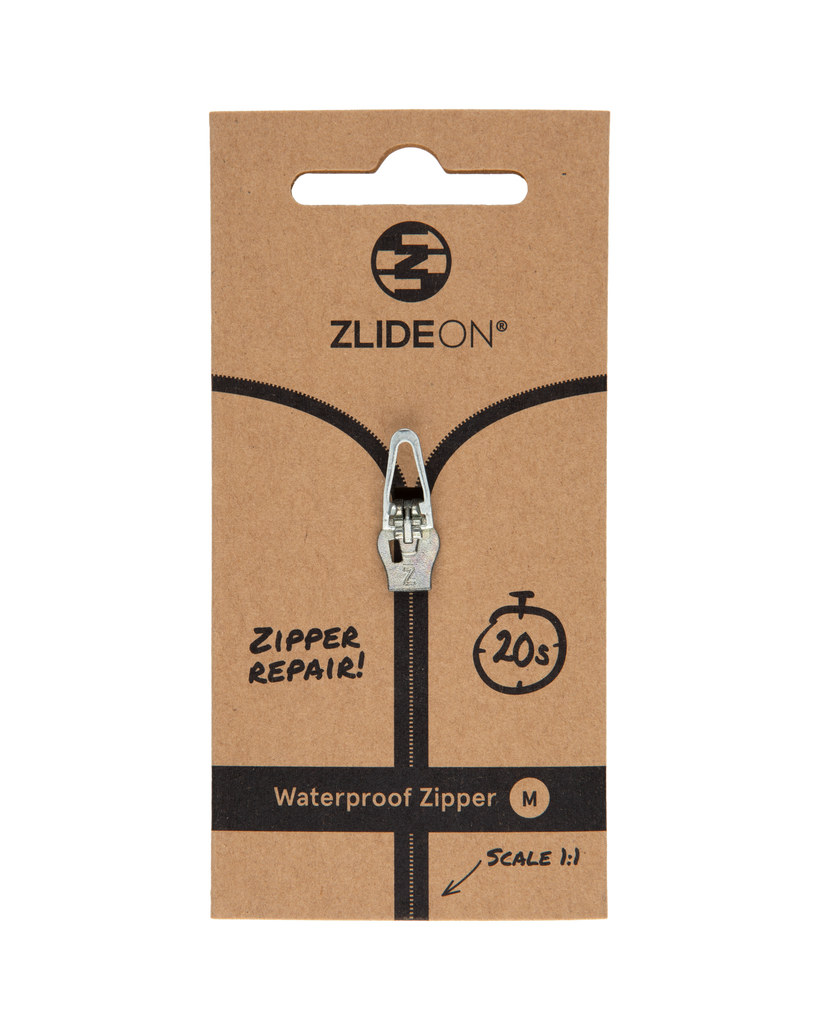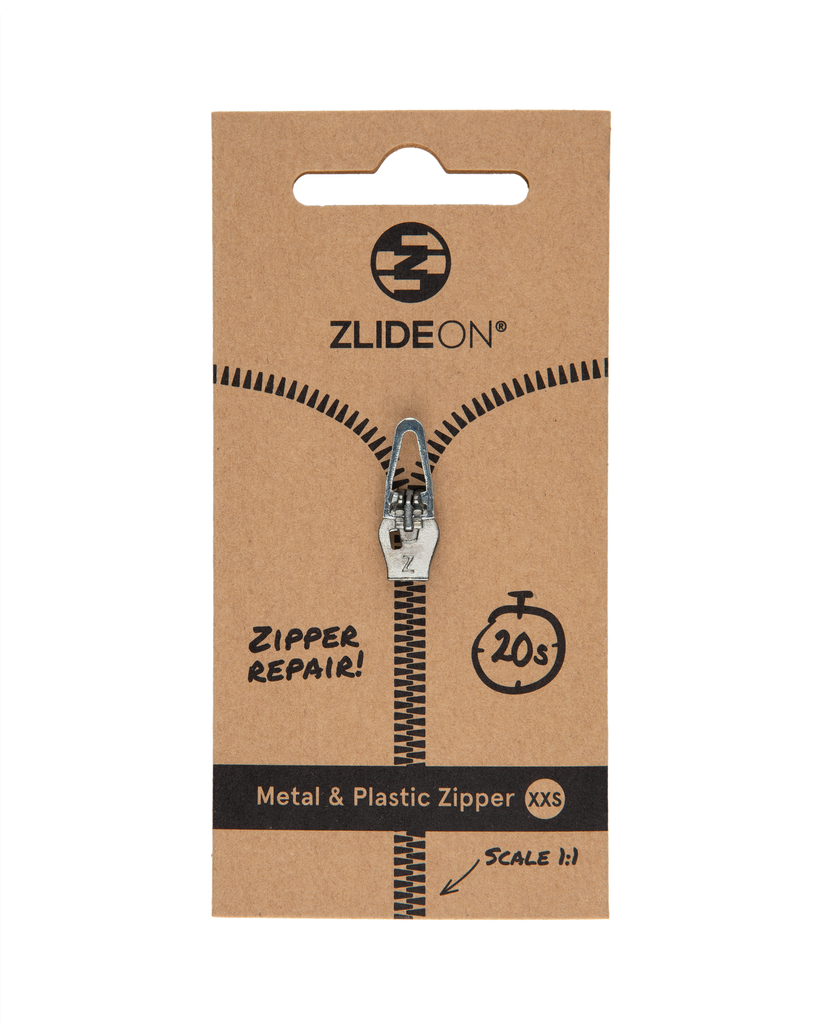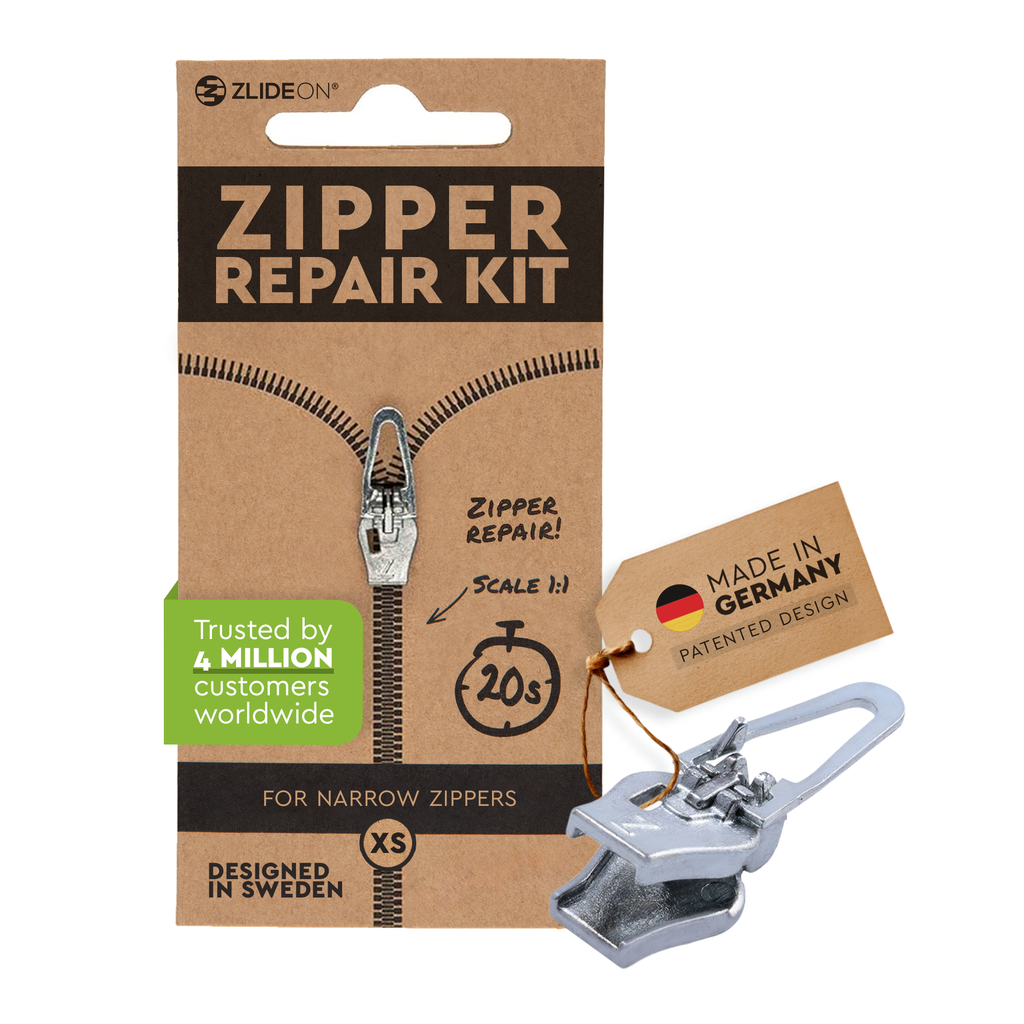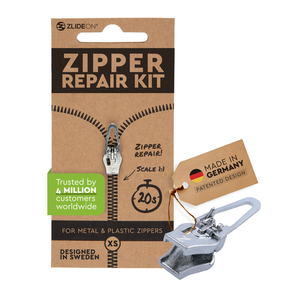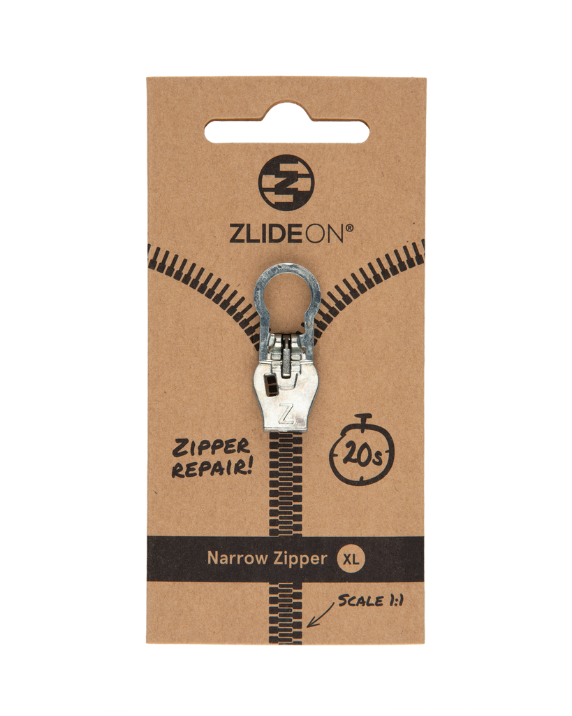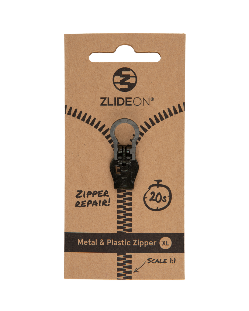 ZlideOn est une innovation suédoise brevetée qui répare les fermetures éclair cassées en remplaçant le curseur, et non la fermeture entière. Aucune couture n'est nécessaire. Il suffit de retirer l'ancien curseur, de clipser le ZlideOn, et la fermeture éclair fonctionne à nouveau en quelques secondes.